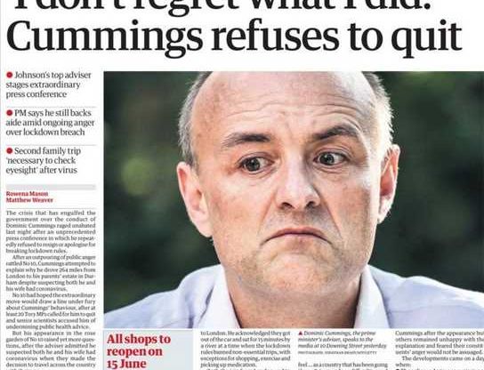 Cummings odniósł się również do sytuacji z 27 marca zeszłego roku, gdy cztery dni po rozpoczęciu pierwszego lockdownu, w czasie gdy obowiązywał zakaz przemieszczania się bez uzasadnionych powodów, zawiózł żonę i syna z Londynu na farmę swoich rodziców w hrabstwie Durham. Będąc na miejscu, 12 kwietnia odbył ok. 45-kilometrową podróż do Barnard Castle, która jak później wyjaśniał, miała na celu sprawdzenie jego wzroku przed 400-kilometrową podróżą powrotną do Londynu. Gdy sprawa wyszła na jaw, wzbudziła ogromny gniew i oskarżenia o podwójne standardy.