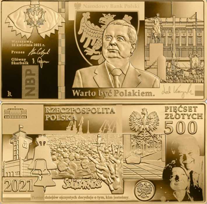 Będzie wykonana ze szczerego złota! Przyjmie nietypowy, prostokątny kształt i nominał 500 złotych. Ważyć będzie jedną uncję, a na jej przodzie również będzie widniał wizerunek Lecha Kaczyńskiego. Tył będzie identyczny, jak na 20-złotowym banknocie.